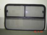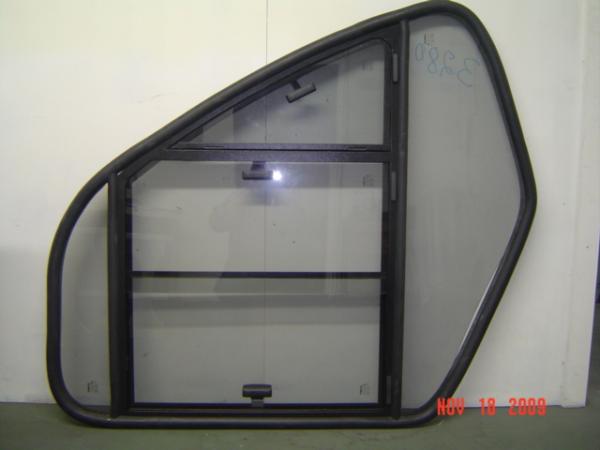 Janelão do motorista e caroneiro, com vidros móveis, ventarola e vidros fixos.